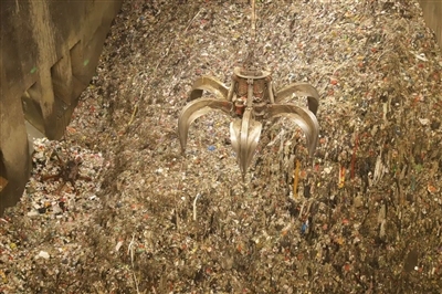 深能环保龙岗能源生态园垃圾焚烧发电厂,垃圾被抓起投放焚烧炉。