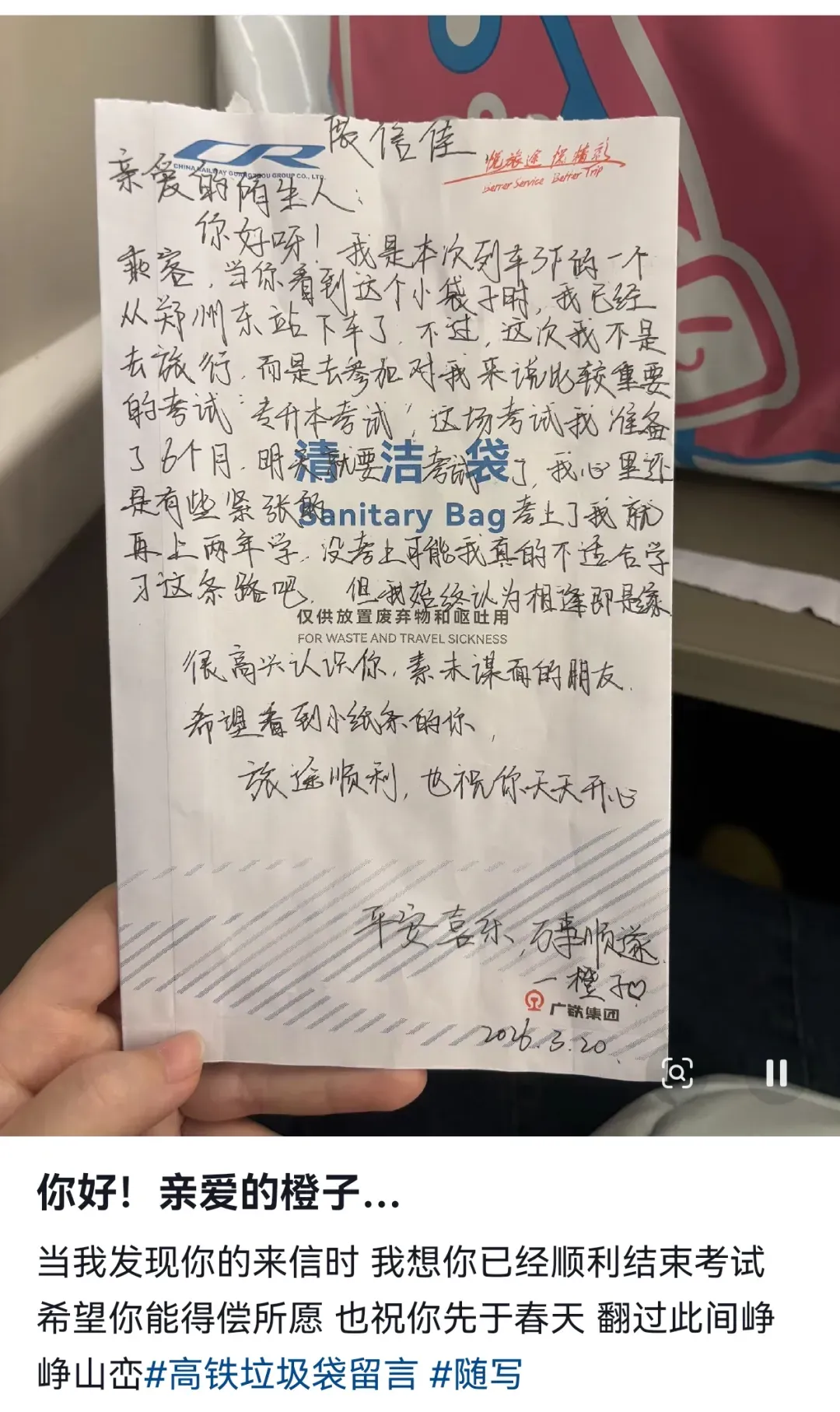 “我收到了陌生人送来的‘漂流瓶’!” 近日 一名网友在高铁上看到了 “前一任”乘客的来信 这位写信的陌生朋友 倾诉了自己即将考试的紧张 “这次我是去参加 对我来说很重要的一个考试 心里还是有些紧张 不过 很高兴认识你 我素未谋面的朋友 祝你旅途顺利,天天开心!”